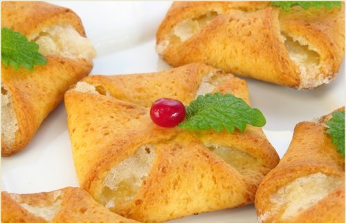 Ингредиенты: 400 г творога 5-9% 200 г сливочного масла или маргарина 150 г сахара (+ на посыпку) 2 ч.л. разрыхлителя (или 1 ч. л. гашеной соды) 300-350 г муки Рецепт приготовления: Масло растереть с 150 г сахара. Добавить творог, перемешать. Добавить разрыхлитель, муку, замесить тесто. Тесто раскатать в пласт толщиной 3-5 мм. Нарезать квадратики 8х8 см. Каждый квадратик посыпать сахаром. Сделать конвертик: для этого надо соединить уголки и хорошо защипнуть. Противень застелить бумагой для выпечки или смазать маслом. Выложить конвертики. Поставить в разогретую до 180 градусов духовку. Выпекать в течение 20-25 минут. |